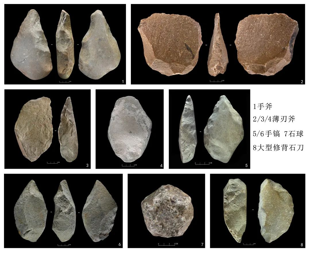该遗址上层石制品包括石核、石片、刮削器、钻器等,工具毛坯以片状为主;下层出土大量巨型石片,工具毛坯以大型石片、砾石为主,既有石锤、砍砸器等,又有手斧、薄刃斧、手镐、大型石刀、石球等阿舍利工具组合。