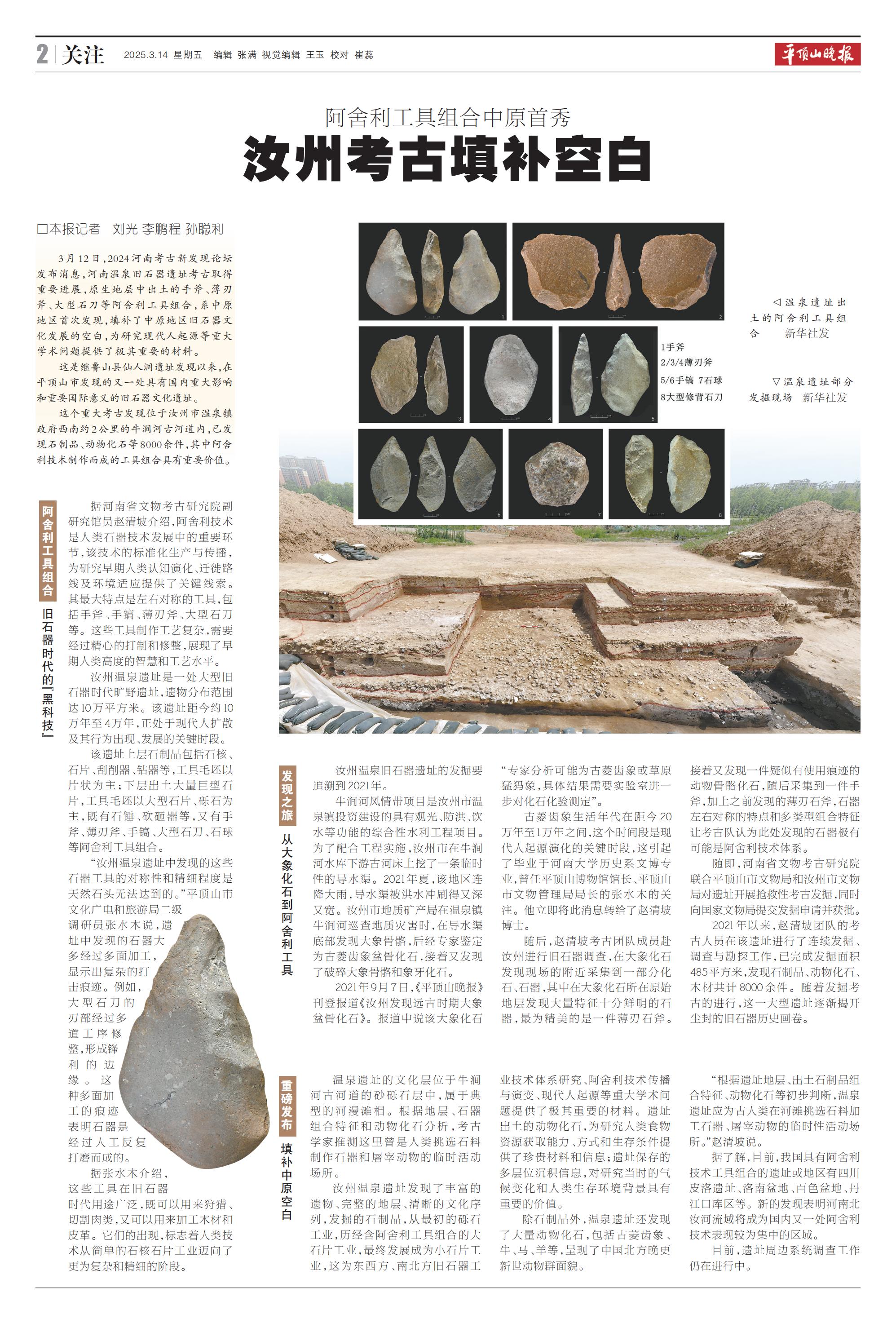 3月12日,2024河南考古新发现论坛发布消息,河南温泉旧石器遗址考古取得重要进展,原生地层中出土的手斧、薄刃斧、大型石刀等阿舍利工具组合,系中原地区首次发现,填补了中原地区旧石器文化发展的空白,为研究现代人起源等重大学术问题提供了极其重要的材料。