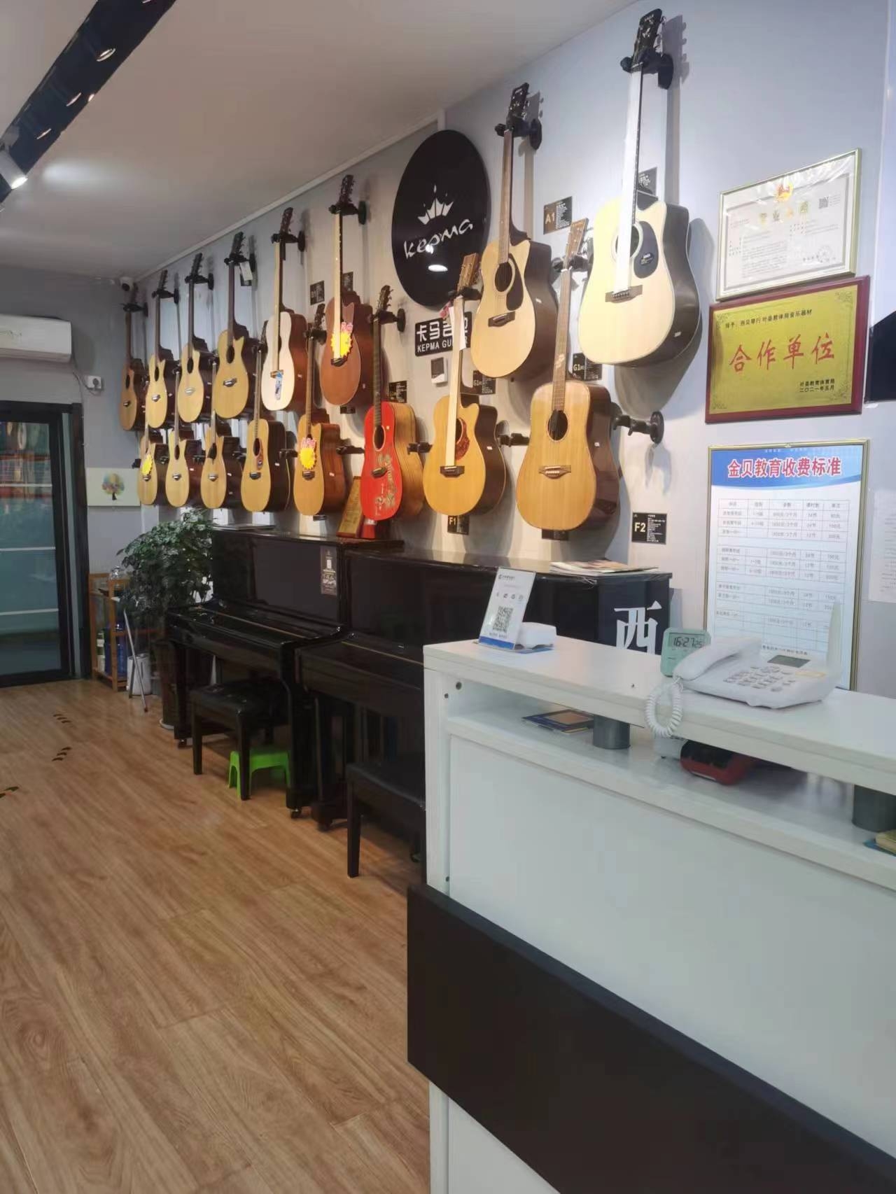 本校拥有舒适、安全、明亮的教学环境,教学设施齐全,消防设施达标!拥有三角架钢琴1台,钢琴12台,电钢琴1台,架子鼓8台,吉他30多把,一对一教室5间,多功能教室两间,充分满足学生的学习需求。